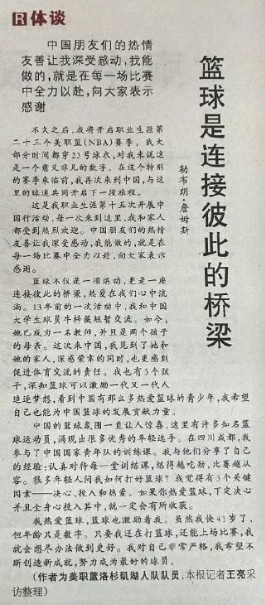 被中国球迷所感动,重逢当年的球迷,赞美中国的篮球氛围与热情,展望自己下赛季,等等。