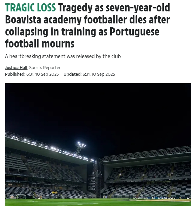 09月10日讯 据《太阳报》报道,葡萄牙俱乐部博阿维斯塔的一名7岁青训球员在训练中倒地身亡,使葡萄牙足球界再次陷入哀悼之中。