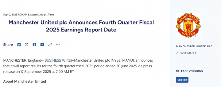 09月15日讯 曼联官方上周向投资者发布了一份声明,宣布将于美国东部时间9月17日上午7:00(北京时间9月17日19:00)公布俱乐部2025财年第四季度的业绩,截至6月30日。